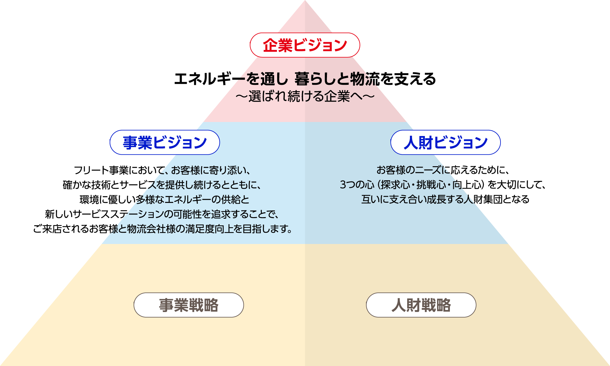 私たちは、ご来店されるお客様・物流会社様のニーズに誠実に向き合い、安心安全なカーライフと心安らぐ快適な空間をお届けし、さらなる満足を提供するため挑み続け、次のことに取り組み、サービスステーションの可能性を拡げていきます。